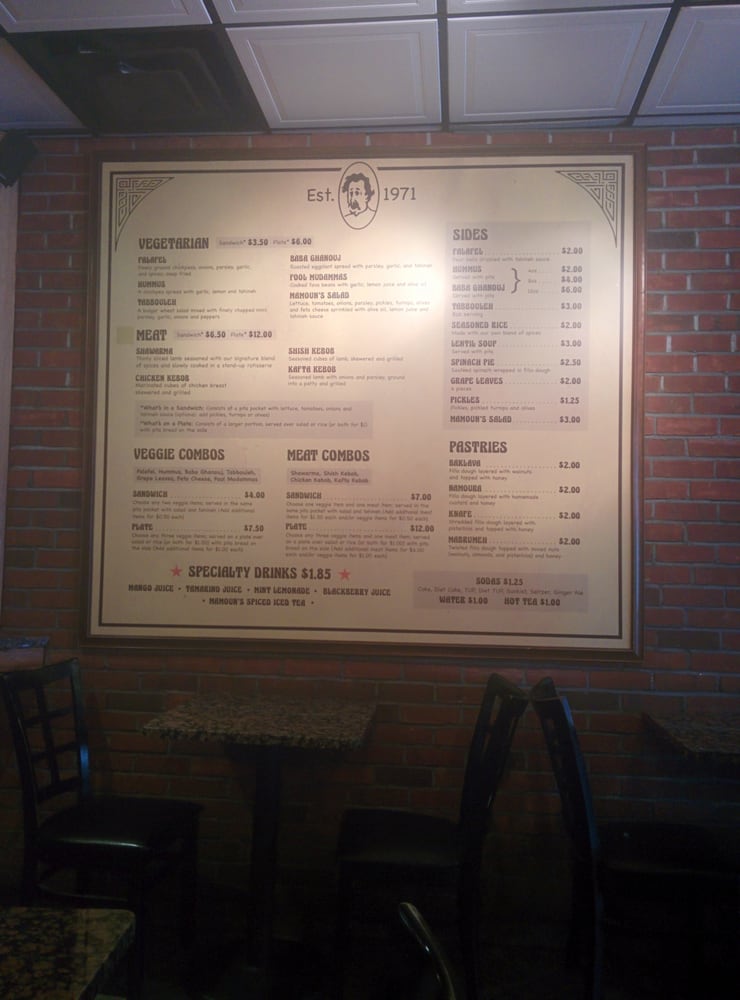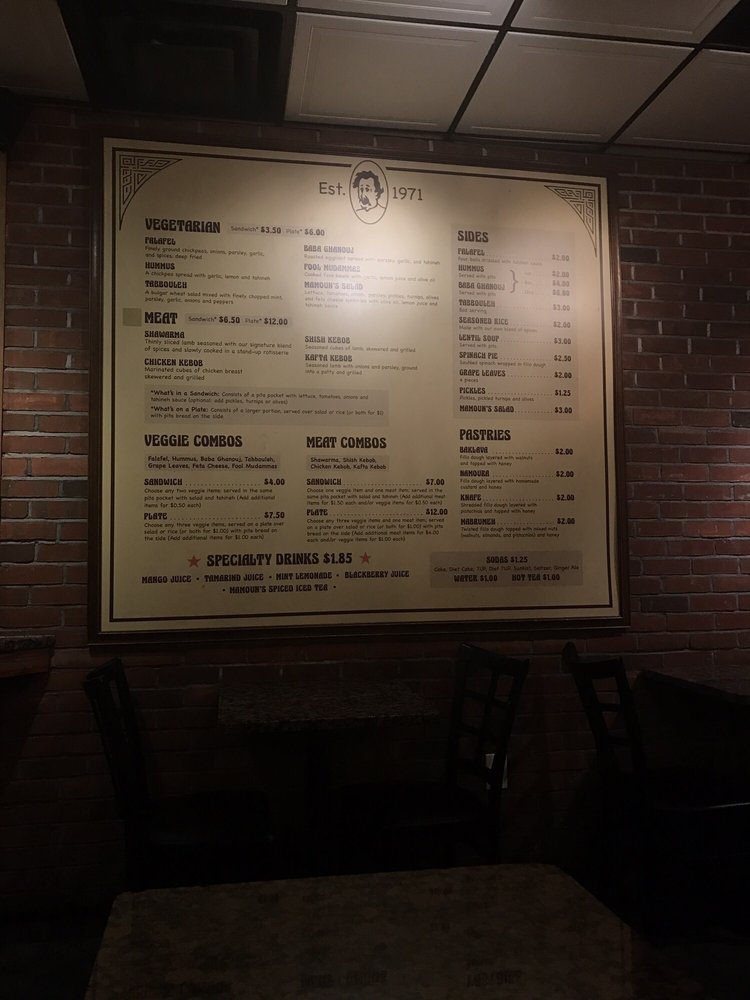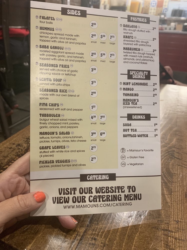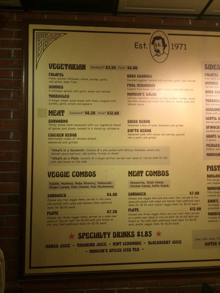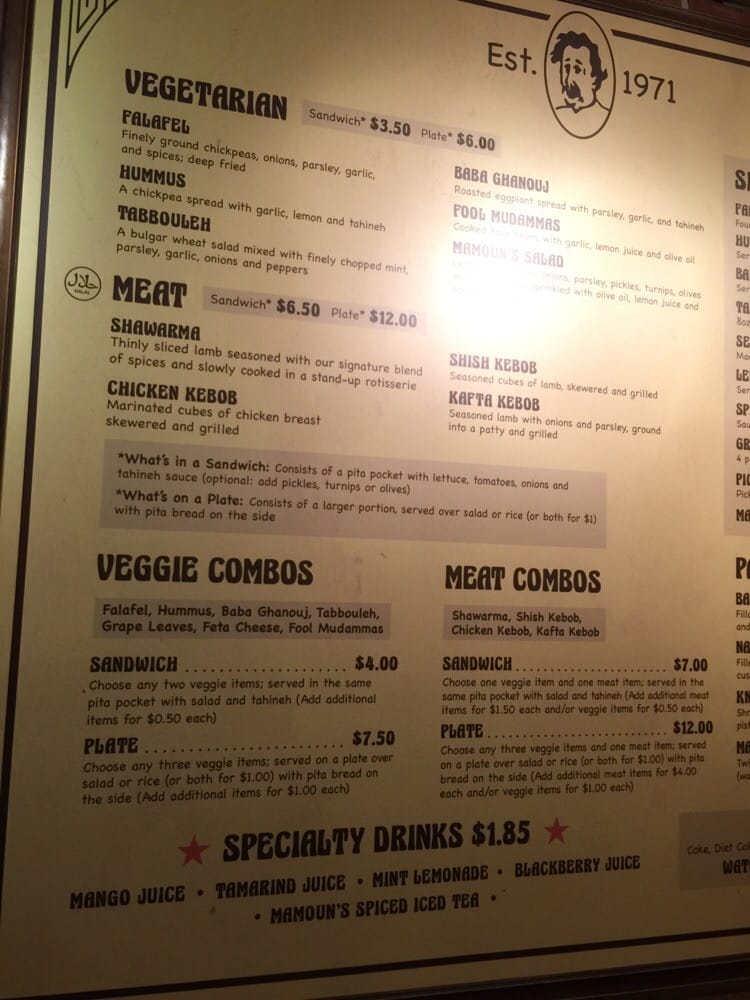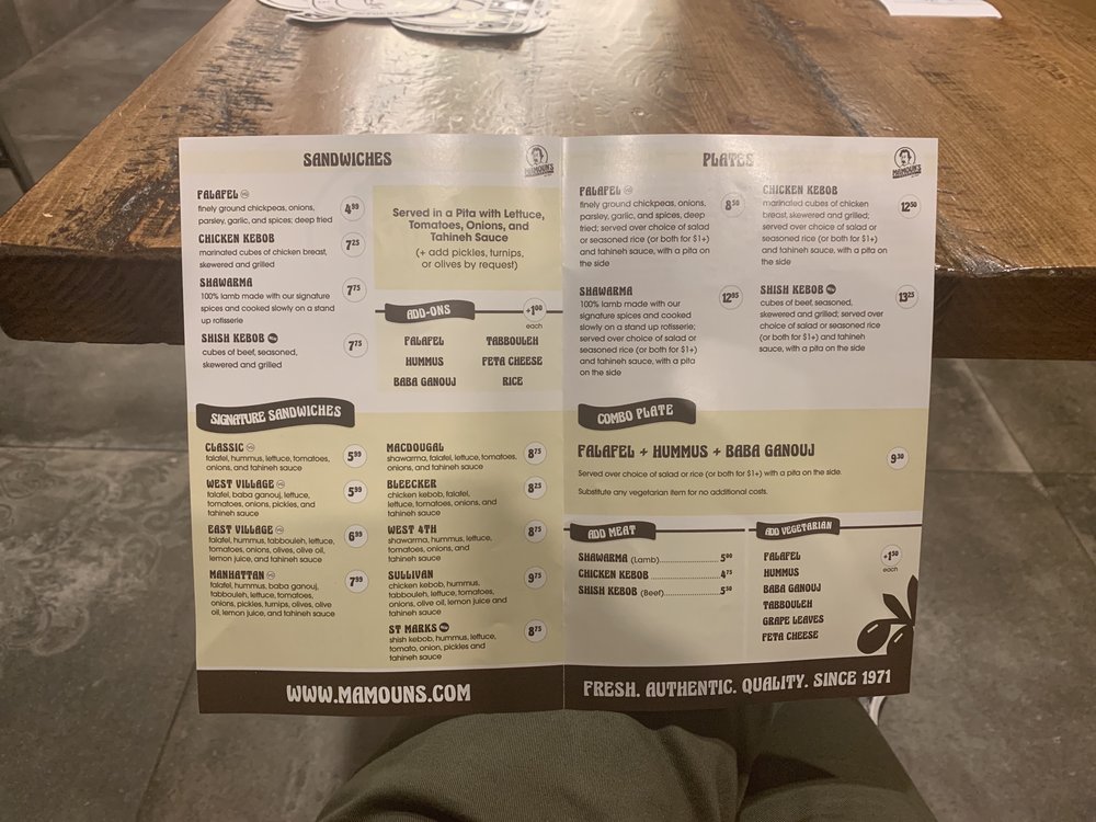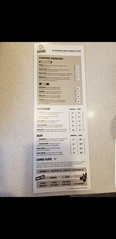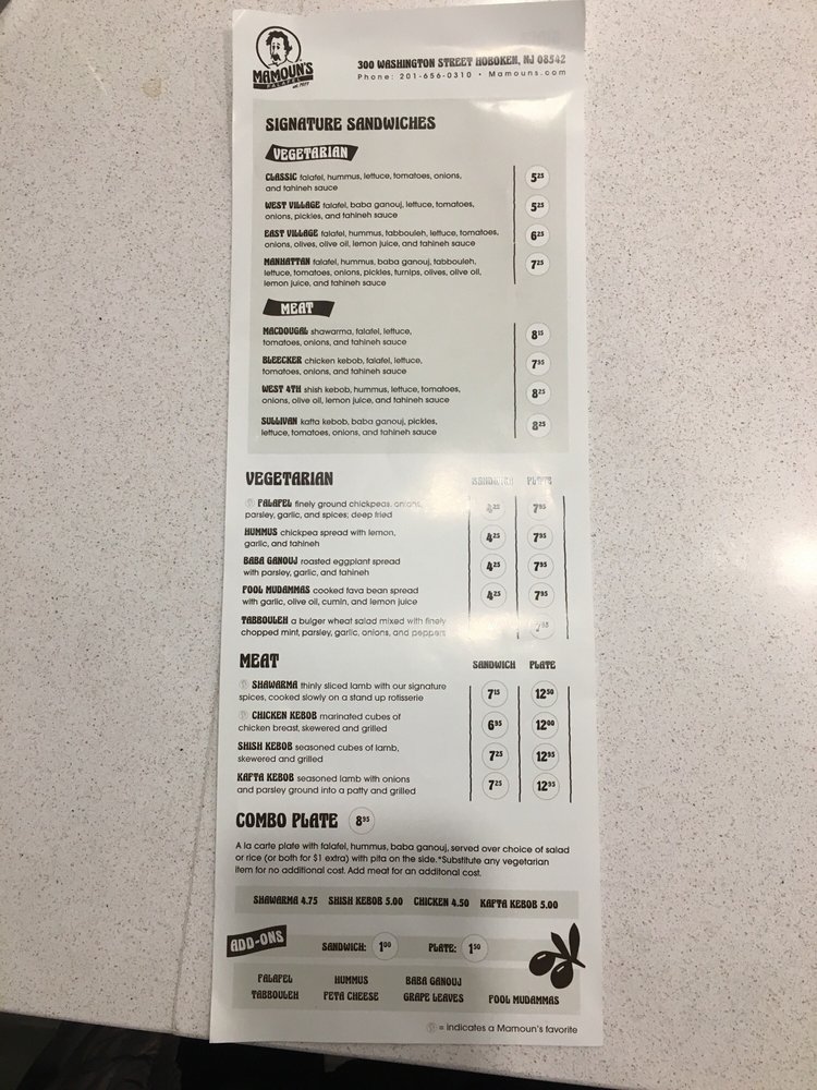 Introducing the menu at Mamoun's Falafel, a beloved Middle Eastern spot in Hoboken, NJ. Choose from traditional sandwiches like the Falafel Sandwich or the flavorful Shawarma Sandwich. Signature options include the Classic Sandwich with falafel and hummus, the West Village with falafel and baba ganouj, and the East Village with falafel, hummus, and tabbouleh. Plates like the Falafel Plate or Shawarma Plate offer a full meal experience. Customers rave about the tasty falafel sandwiches, praising the freshness and flavors. The friendly staff and convenient location make it a go-to for delicious and affordable Middle Eastern cuisine. Don't miss out on this gem for a satisfying and flavorful meal experience.